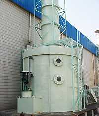 玻璃鋼洗滌塔是硫酸生產(chǎn)線的主要設(shè)備,該塔的主要作用是:由塔底進塔的帶有礦塵、砷、硒、氟、二氧化硫等雜質(zhì)和二氧化碳氣體,經(jīng)填料層,由塔頂排出。而稀硫酸通過塔頂?shù)膰娮靽娏埽怪盍蠈又袣庖撼浞纸佑|,除去雜質(zhì),達到凈化氣體的作用。